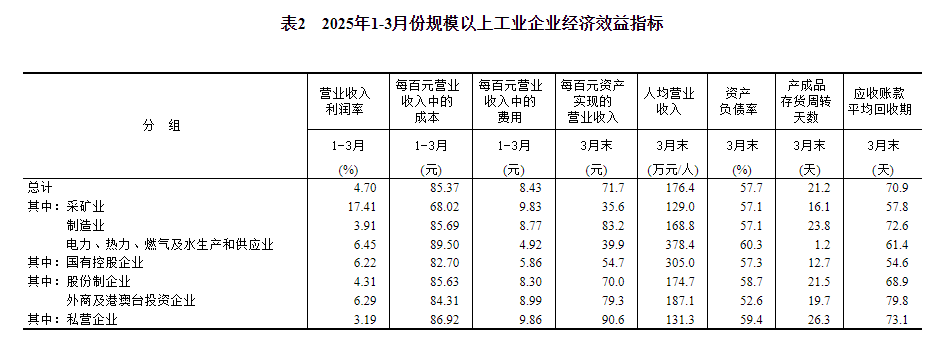 1—3月份,主要行业利润情况如下:农副食品加工业利润同比增长40.3%,有色金属冶炼和压延加工业增长33.6%,专用设备制造业增长14.2%,通用设备制造业增长9.5%,电气机械和器材制造业增长7.5%,纺织业增长7.1%,电力、热力生产和供应业增长6.1%,计算机、通信和其他电子设备制造业增长3.2%,化学原料和化学制品制造业下降0.4%,石油和天然气开采业下降3.1%,汽车制造业下降6.2%,非金属矿物制品业下降14.2%,煤炭开采和洗选业下降47.7%,石油煤炭及其他燃料加工业同比减亏,黑色金属冶炼和压延加工业同比由亏转盈。