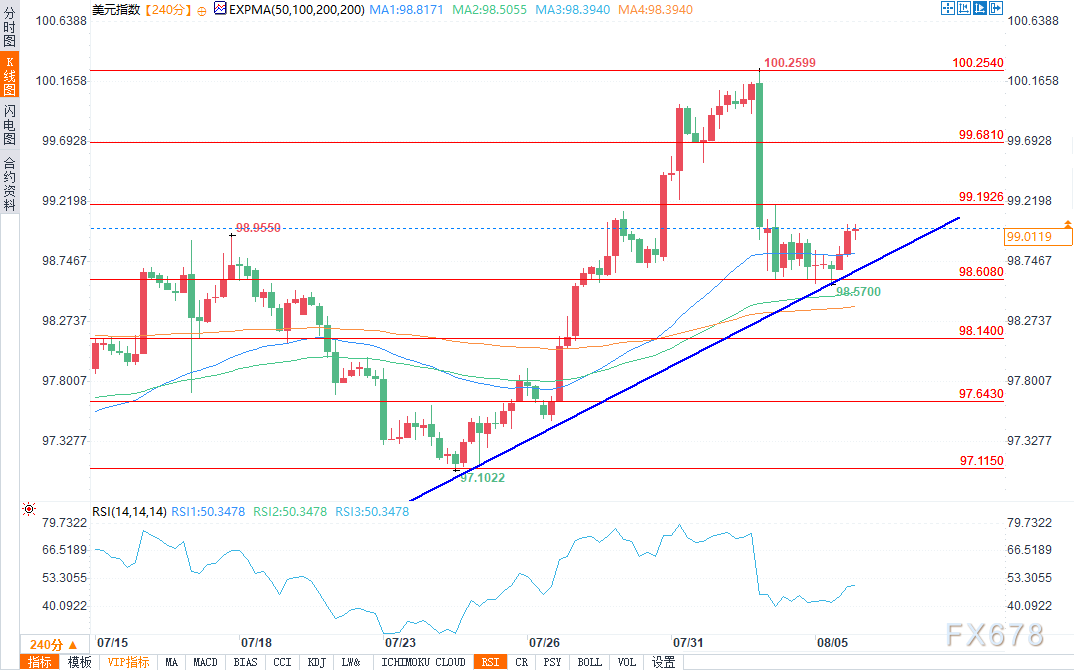 (美元指数4小时图 ) 在4小时图上,美元指数(DXY)维持在上升趋势线上方,自7月23日起保持一系列高点低点。从100.25高点急剧回落之后,指数在50日均线(98.82)和100日均线(98.51)上方企稳,这两个均线目前作为动态支撑。从98.60的反弹与上升趋势线一致,表明买家在关键技术水平上仍有支撑。然而,99.19的水平阻力限制了上行空间,多次突破尝试均告失败。如果美元指数突破并收于99.19上方,可能重新测试99.68。反之,若跌破98.60,可能引发更深的回调至98.14或97.64。 市场驱动因素展望 预计7月份ISM服务业PMI为51.5,可能为美元提供短期催化剂。如果数据强于预期,可能支持美元指数小幅回升,但涨幅可能在99.00-99.25区间内受限。与此同时,美联储领导层的变动以及美国对金砖国家的贸易政策将继续影响投资者情绪和美元表现。