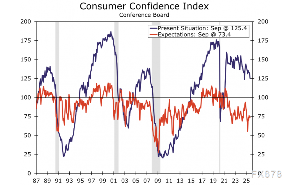9月消费者对现状及未来12个月预期的评估双双恶化。观察图表可以直观感受到紧迫性——蓝线(现状指数)与红线(预期指数)均已逼近过去三次经济衰退前的水平。需要明确的是,市场并不认为衰退将至,但衡量情绪的软数据与反映实际支出的硬数据之间确实发出了矛盾信号。