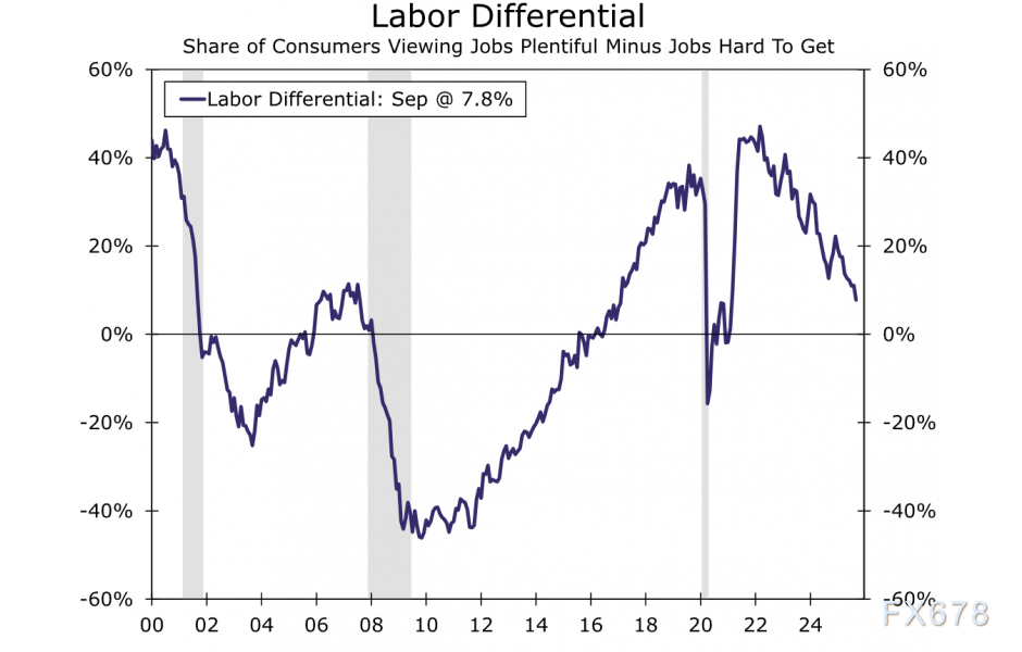 要准确把握当前美国消费者的真实心态,市场更倾向于借助“就业差指数”(见图表)这组透视镜。该传统指标通过“就业充足”与“就业难寻”两项数据的差值构建。其持续下行的趋势线,正映射出过去两年劳动力市场逐渐失速的实况。