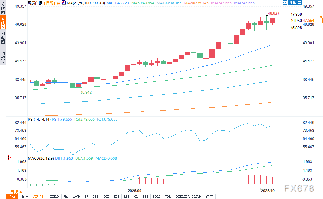 当前黄金在历史高点附近盘整,市场对美联储政策的预期偏向鸽派,白银从货币政策与技术面两方面均获得推动。 美联储降息预期推动贵金属买盘 美国政府停摆导致非农就业报告等关键经济数据延迟发布,市场被迫高度依赖替代指标判断行情。结果显示,交易者已完全消化美联储下次会议降息25个基点的预期——芝商所美联储观察工具显示,10月降息概率为97%,12月降息概率为88%。 达拉斯联储主席洛里·洛根(Lorie Logan)虽表态将采取“观望”立场,但也强调“上次降息具有前瞻性”,暗示若经济状况恶化,不排除进一步宽松的可能。这种鸽派倾向推动所有贵金属全面上涨。 美元承压,收益率持稳 美国美元指数正经历7月以来表现最差的一周,当前下跌0.1%,报97.78。 与此同时,美国国债收益率小幅走高:10年期国债收益率报4.092%,30年期国债收益率接近4.691%。通常收益率走高会对白银构成压力,但当前行情显示,交易者认为美联储将优先选择降息,而非抑制通胀。 本周美元走弱仍是影响贵金属走势的主导因素,即便面对债券收益率上涨,仍助力白银维持坚挺。 黄金走强为白银动能供支撑 黄金正朝着连续第七周上涨迈进,目前周涨幅达2.8%,并在3897.13美元的历史高点下方盘整。若黄金突破该点位,心理关口4000.00美元或成为下一个目标。 黄金的看涨态势为白银的上行动能提供支撑,尤其是印度实物需求升温,而中国仍处于节假日休市状态。 贵金属间的强关联性意味着,若黄金突破关键点位,白银或随之上扬。 白银预测:关注46.93美元支撑位与48.03美元阻力位