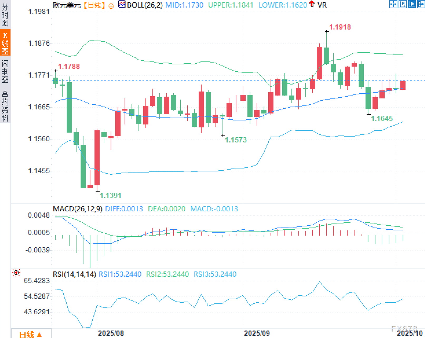 MACD贴近零轴运行,DIFF与DEA小幅回落后趋于钝化,柱状图动能缩窄,表明趋势性不强、以“均值回归+震荡”为主;RSI(14)位于约53,处于中性略偏多的区域,既未触发超买,也未出现明显顶背离信号。整体而言,短线是“围绕中轨的水平通道/箱体振荡”,若有效上破1.1769并站稳中轨之上,才有望对1.1840发起回测;反之跌破1.1731—1.1685区间,则1.1645与1.1622将依次承接。 市场情绪观察 情绪维度上,当前属于“基本面多空互轧、数据真空放大噪音”的阶段: 1)权益市场创高带来“风险偏好抬升—美元受抑”的跨资产联动,支撑欧元的同时削弱了避险吸引力; 2)利率市场押注年内“10月+12月”两次降息,但Logan等官员的谨慎立场压制了过度鸽派的延伸,美元在“预期—表态”的拉扯间呈现反复; 3)期权与波动率框架下,布林带宽度维持收敛,历史波动率回落意味着短线“方向爆发”的概率在累积;而RSI居中、MACD零轴附近横摆,提示市场共识尚未形成,交易员更偏向区间策略与事件驱动的快节奏切换。换言之,情绪并未转向单边的多头或空头,而是对关键位的“确认与否”高度敏感。 后市展望 短线情景A(偏多): 若后续FOMC发言未进一步抵消降息预期,且风险偏好延续,则美元回落、欧元温和走高成为主线。价位上,1.1769为首道触发点,站稳后指向布林上轨1.1840;若在外生事件催化下放大波动并上冲,1.1918的前高将成为多头的确认关口。此路径需配合MACD在零轴上方金叉与柱状图由负转正的“量能共振”。 短线情景B(偏空): 若官员言论偏鹰提升美元吸引力,汇价跌破中轨1.1731并回落至1.1685,则将验真区间下沿;若进一步击穿,则1.1645与布林下轨1.1622成为多重支撑带。跌破1.1622将打开指向1.15整数关口的更大级别回撤空间,但这一情景目前需要“美利率上抬+风险厌恶”双重配合。