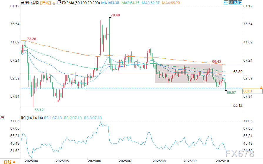 以哈停火后,中东风险溢价下降 以色列与哈马斯达成停火协议后,地缘政治风险溢价逐步消除,原油价格随之回落。在美国支持的协议框架下,以色列将从加沙部分撤军,以换取人质和囚犯的释放。紧张局势缓解后,红海和苏伊士运河航道面临的威胁降低——这两条航道在近几个月一直是支撑原油价格的重要因素。 北欧联合银行(SEB)的比亚尼·希尔卓普(Bjarne Schieldrop)表示:“停火协议的生效,让市场对全球原油运输安全的担忧有所缓解。”这一变化正在逐步消除2023年末以来油价中包含的战争相关风险溢价。 尽管停火新闻受关注,欧佩克产量仍为市场焦点 尽管加沙停火协议占据新闻头条,但交易员正将注意力重新转向供应前景。欧佩克+(OPEC+,石油输出国组织及其盟友)同意11月的产量增幅低于预期,这在一定程度上缓解了市场对供应过剩的担忧。BMI(研究机构)分析师指出,近期的供应增长“并未导致油价大幅下跌”,这为布伦特原油(Brent,国际基准原油)单周小幅上涨提供了支撑。 不过,WTI原油单周仍下跌0.5%,而布伦特原油单周上涨1%。美国政治风险仍在市场关注范围内,因对政府长期停摆的担忧可能会影响经济活动及能源需求。 市场展望:63美元阻力位下方看空情绪升温