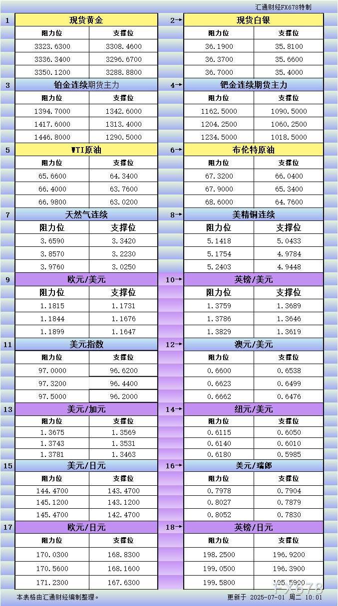 XM官网7月1日亚市更新支撑阻力:18品种支撑阻力(金银铂钯原油天然气铜及十大货