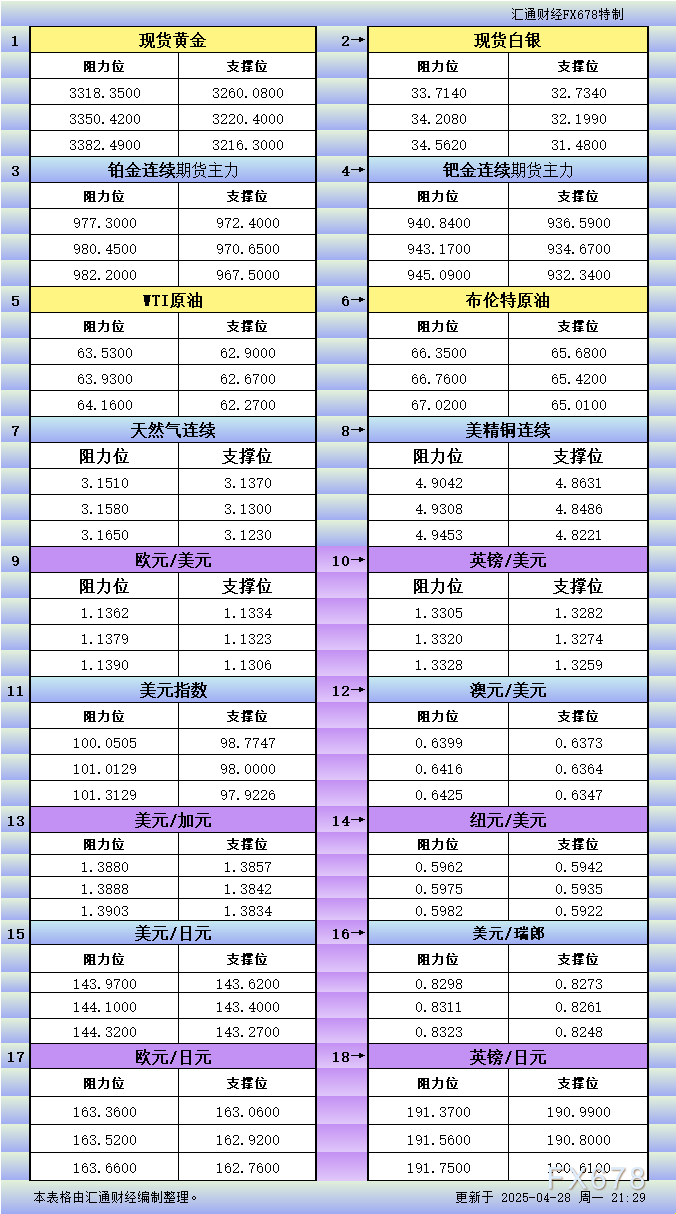 XM中文官网:4月29日亚市更新支撑阻力:18品种支撑阻力(金银铂钯原油天然气铜